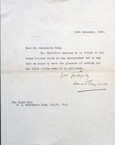 Letter from Fergusson to King, next to flyleaf with Churchill’s signature. Select image to view larger size.