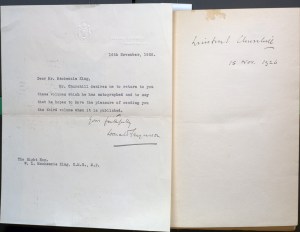 history makes it more interesting. While signed items by Churchill are not that uncommon, the copy has both his signature on the front fly-leaf, and contains a letter from Donald Fergusson, private secretary to Churchill while the latter was Chancellor of the Exchequer from 1924-1929. As seen in the letter embossed with the coat-of-arms of the office of the Chancellor of the Exchequer, Fergusson writes to Canadian Prime Minister William Lyon Mackenzie King on November 16th, 1926 that Churchill requested the return of the signed volumes to King and that he hopes to send a copy of the third volume when published.