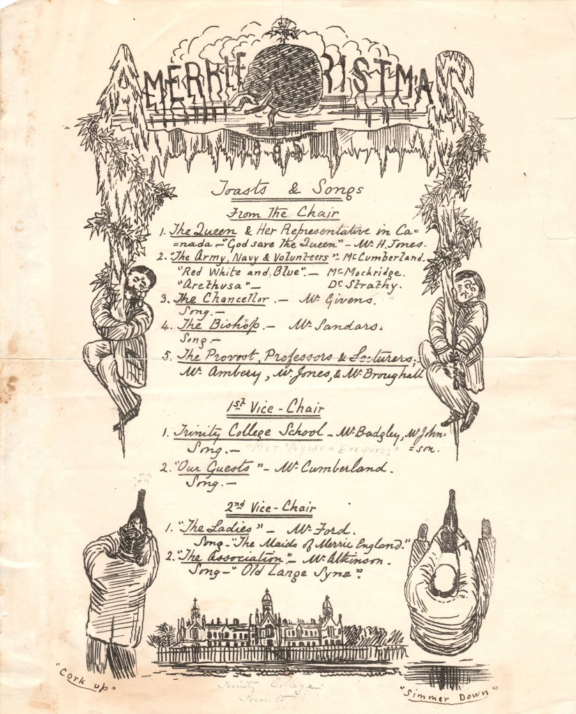 The item is a program listing the order of toasts and songs, and who will be leading each, for a Christmas dinner held by Trinity College in 1865. It begins with a toast, delivered by professor of mathematics William Jones, to Queen Victoria and the Governor General, followed by the singing of “God Save the Queen.” Thereafter follow toasts to military personnel, Chancellor Cameron, Bishop Strachan, the provost and faculty, the Trinity College School (founded earlier that year in Weston, later moved to Port Hope), the guests, the “ladies” (presumably the wives of those attending the dinner, as Trinity College did not yet accept women as students), and finally the association, concluding with a no doubt rousing rendition of “Old Lange [sic] Syne.”