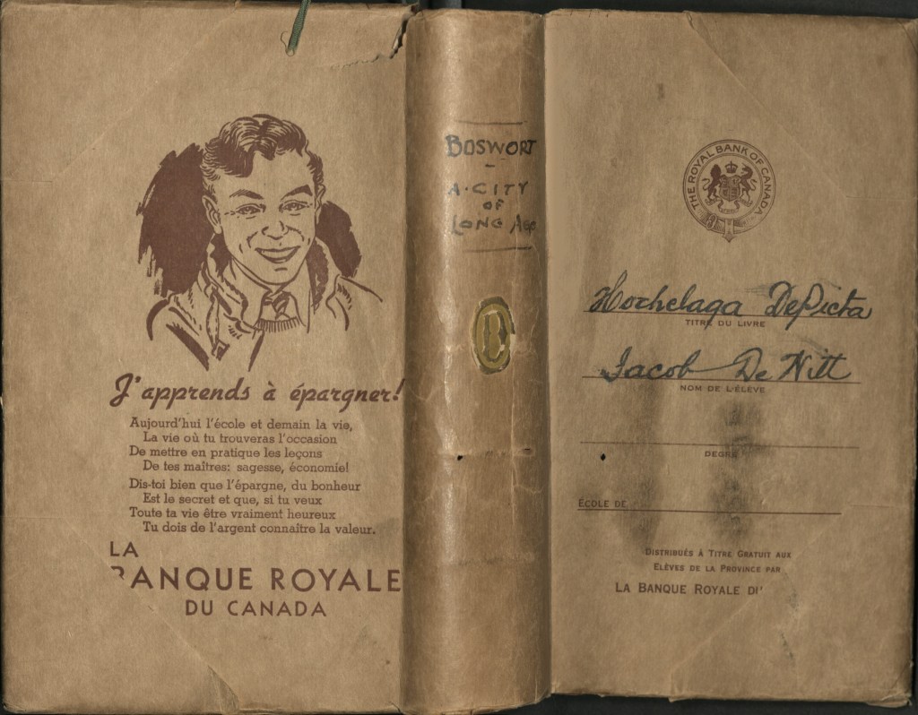 Besides the postcards, the copy also carries another ephemera example in the form of a branded promotional dustjacket from the Royal Bank of Canada that had been distributed to students in Quebec, which bears the name of a previous owner, Jacob de Witt.