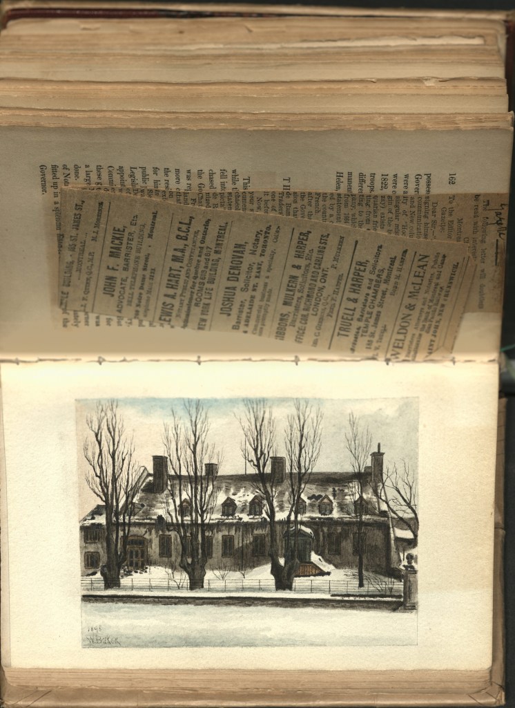 But what is particularly unique about this copy is that it contains thirteen “extra-illustrations” or items that have been intentionally bound or pasted in, and not originally issued by the publisher. The practice was common between the late 18th century to the 1930s, and there are many surviving examples in libraries of very elaborate extra-illustrated books by wealthy book collectors. While the practice bears some resemblance to scrapbooking, what differentiated extra-illustration was that the items were usually relevant to the topic of the book and the illustrations were incorporated as a thematic enhancement. In the original published form, Hochelaga Depicta is heavily illustrated with black and white plates and two fold out maps. But at some point, previous owner has had the book rebound to include thirteen small watercolour with pen and ink illustrations depicting various buildings and scenes in Montreal. Most are unsigned, but a couple bear the signature of W. Baker, 1898, which may have been by artist Walter Baker (1859-1912).