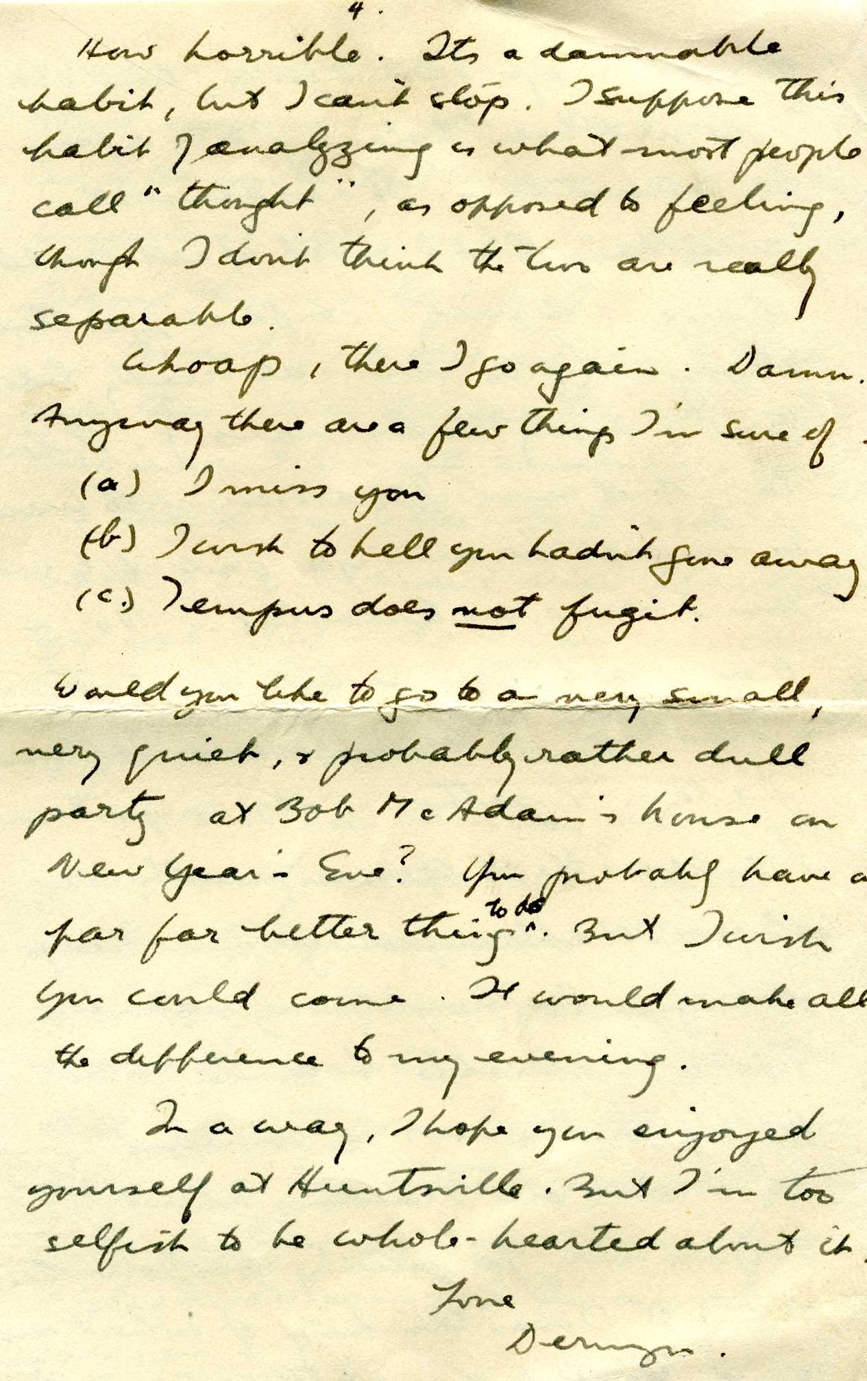 In honour of Valentine’s Day, we offer a 1940 love letter (first and last pages) from Derwyn Owen, Provost of Trinity College from 1957 to 1971, to his soon-to-be wife Anne Armour. At the time Derwyn Owen was attending the Union Theological College in New York and there are 157 letters from this period to Anne, whom he married in 1942 when he completed his degree.