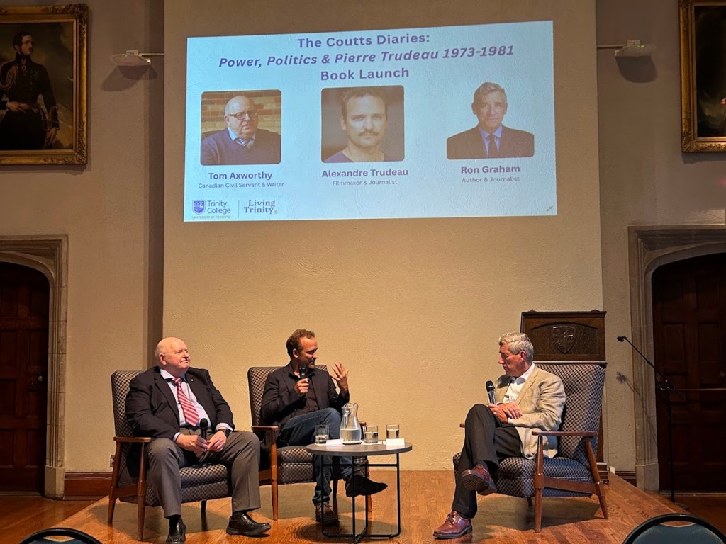 On the evening of September 16th, 2025, Ron Graham launched his newest book, The Coutts Diaries: Power, Politics & Pierre Trudeau 1973-1981 in Seeley Hall at Trinity College. The event was the culmination of Graham’s long hours spent in the Trinity College Archives, researching the private diaries of Jim Coutts, principal secretary to Prime Minister Pierre Elliott Trudeau from 1975 to 1981.