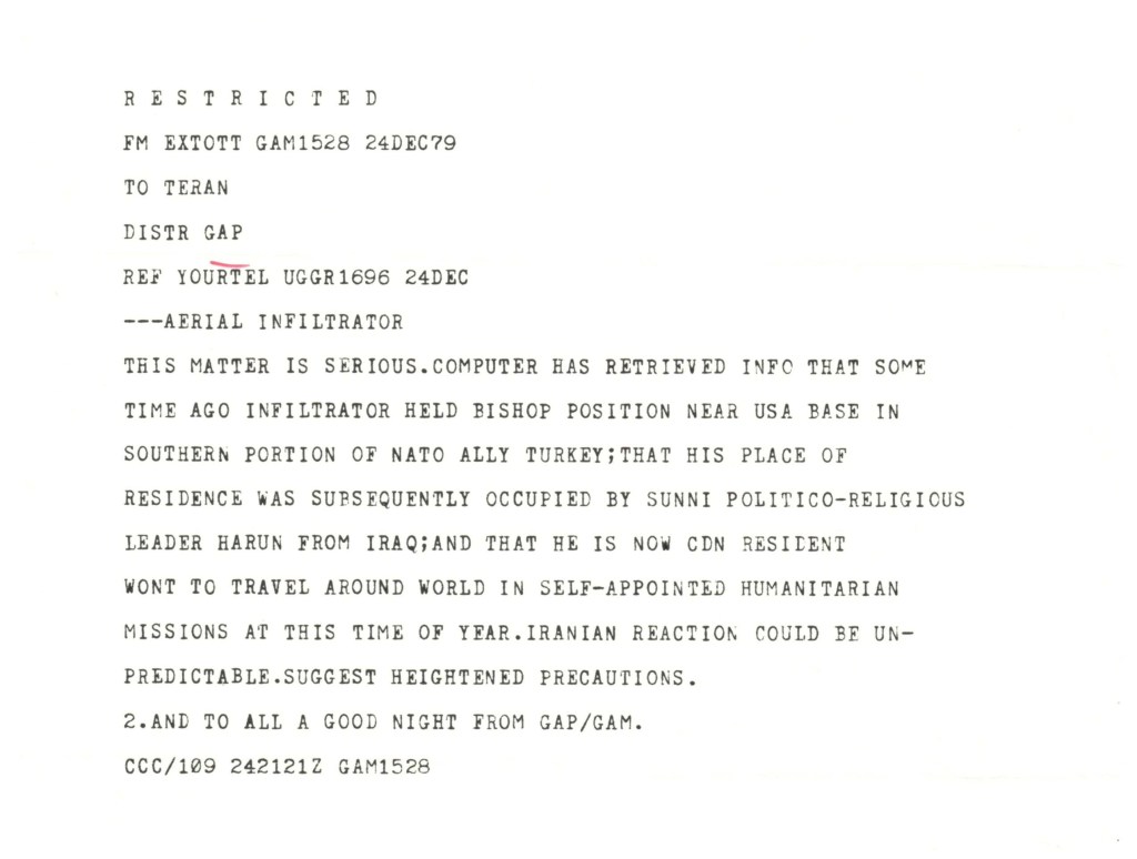 On December 24, 1979, a telegram went out from Ambassador Ken Taylor at the Canadian Embassy in Tehran to Michael Shenstone, director-general of African and Middle Eastern Affairs at External Affairs in Ottawa. The two men had been in frequent, near daily contact, since the houseguests had arrived, with Shenstone working on the Ottawa side to coordinate strategies to shelter and protect the Americans. The subject header of the telegram was ominous: