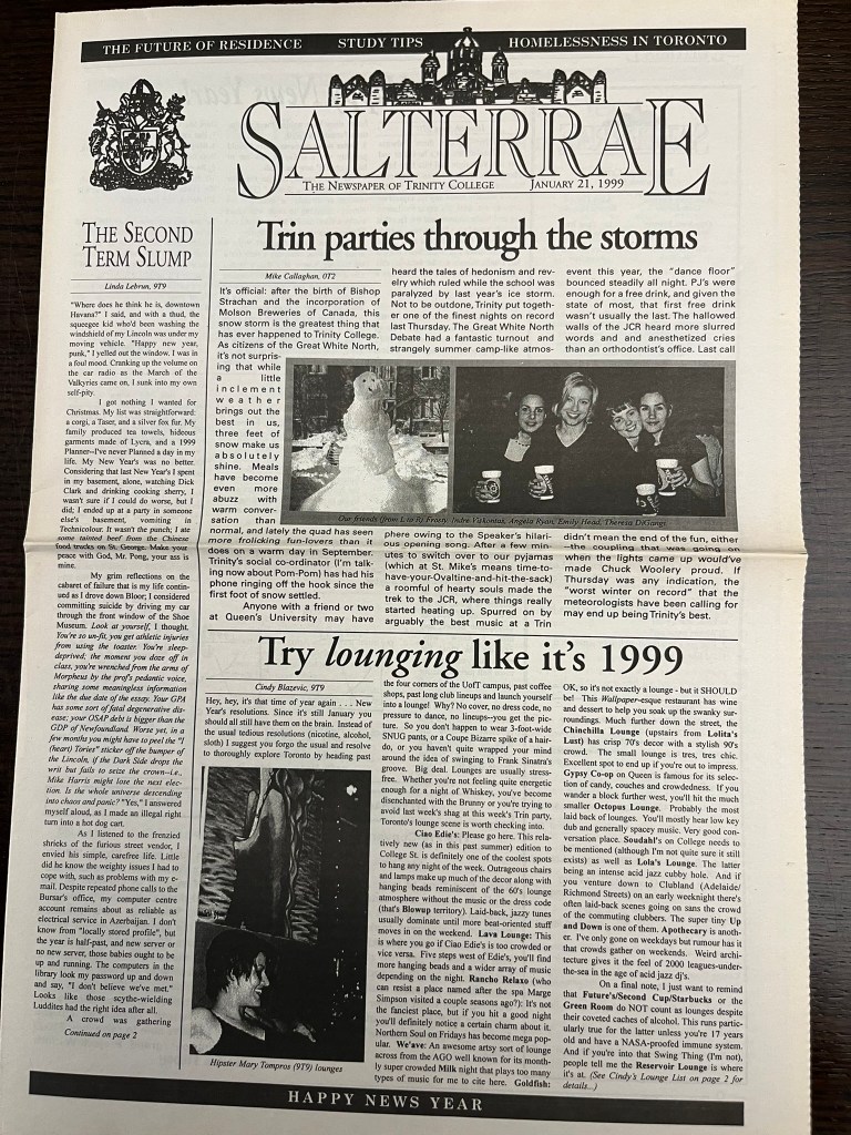 This winter’s record-breaking snowstorms recall one of Toronto’s most memorable winters. In January, 1999, the city accumulated more than 105 centimeters of snow in a period of just two weeks. Some might remember that the Canadian army was even called in, an episode that briefly made Toronto the subject of mirth across the country. But there’s little evidence that the towering snow drifts slowed life at Trinity. If anything, they seemed to heighten the fun. A January 1999 issue of Salterrae preserved in the Archives captured the jolly mood on campus with the headline: “Trinity parties through the storms.” The writer of the article went so far as to declare that “after the birth of Bishop Strachan and the incorporation of Molson Breweries in Canada, this snowstorm is the greatest thing that has ever happened to Trinity College,” before going to recount a raucous Lit debate followed by a pajama party complete with dance floor. Not bad for an evening spent snowbound, indoors.