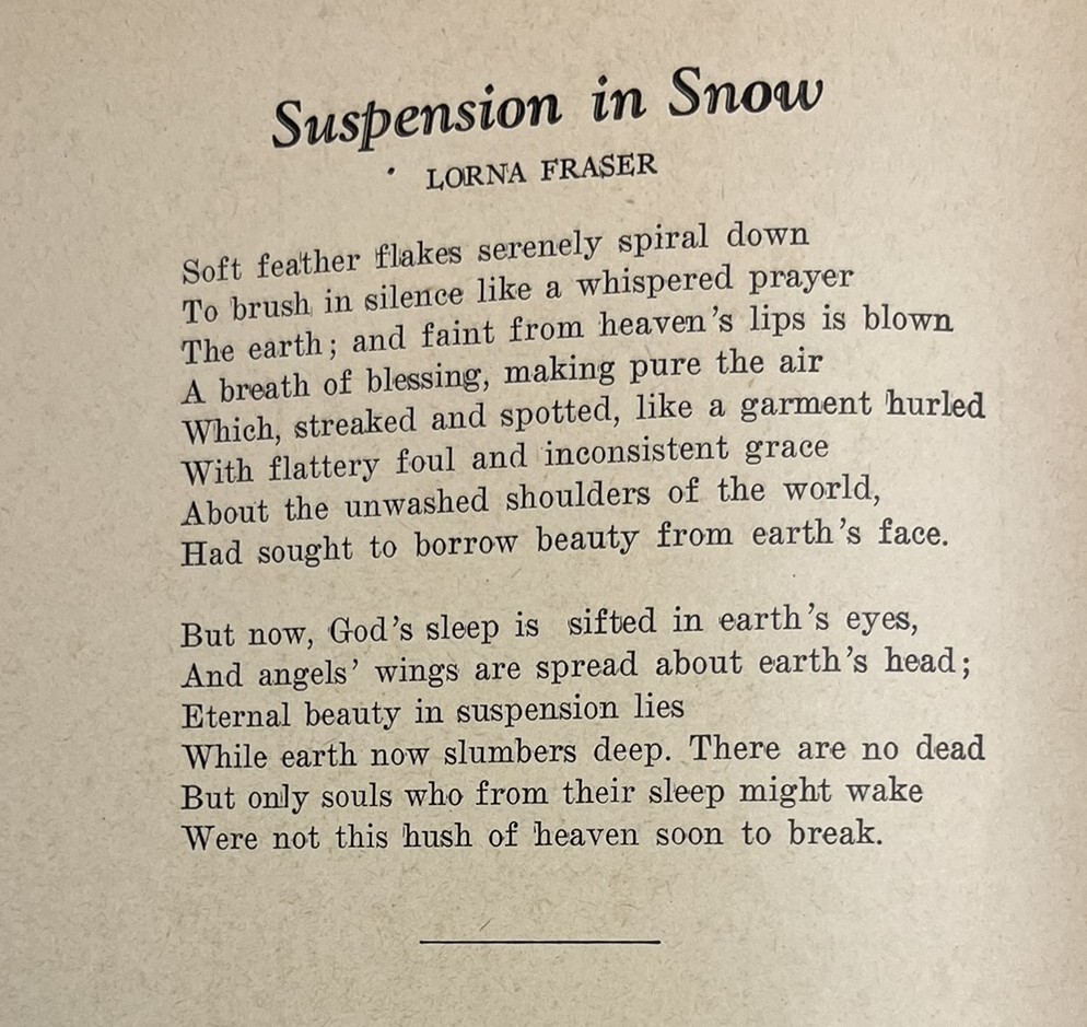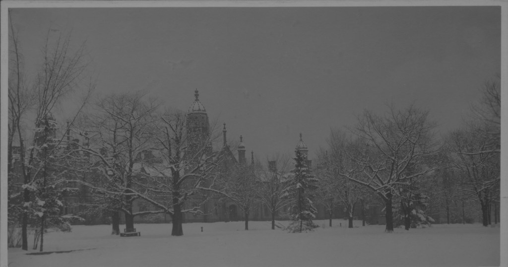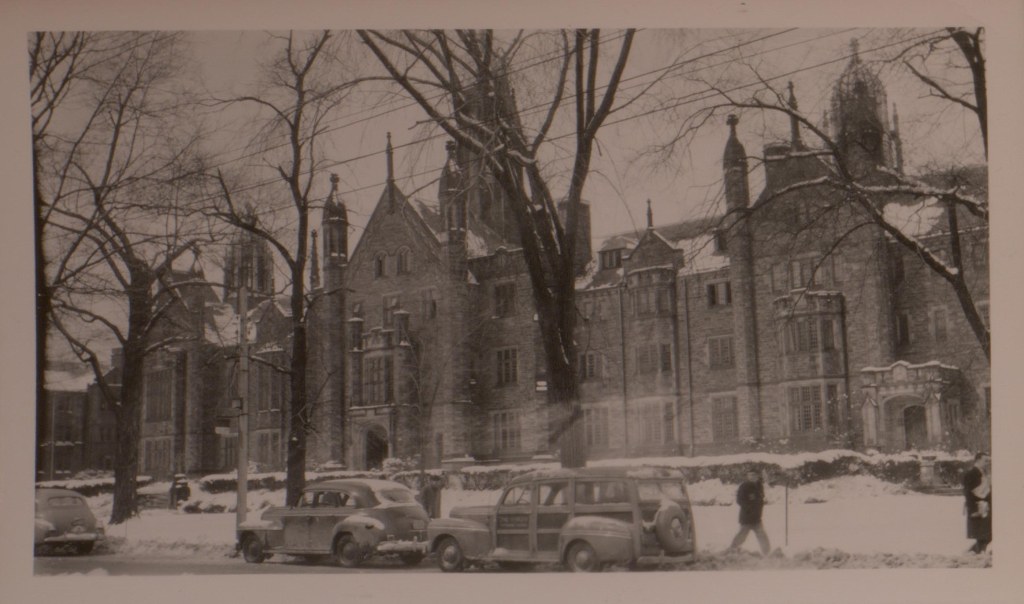 Trinity’s Archives take us back even further. In December, 1944, Toronto was struck by another memorable blizzard, one that dropped a staggering 57.2 centimeters of snow in a single day – a record only surpassed this winter. Curiously, Trinity’s student publications from the time make no direct mention of the storm itself. But one wonders if the storm did leave its mark in other ways, as the December 1944 edition of the Trinity University Review featured not one, but two charming poems devoted to snow. One author strikes a cheerful note, concluding her verse with a resolve to learn to ski. The other adopts a more wistful tone, ending with the lines, “Eternal beauty in suspension now lies / While earth now slumbers deep. There are no dead / But only souls who from their sleep might wake / Were not this hush of heaven soon to break.” Read in the context of wartime, one senses a longing for a peace beyond just the stillness of winter. Yet there is hope here too, that the world can made anew.